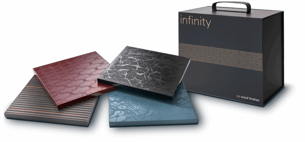 Infinity è il risultato della collaborazione tra Fidia Laser, azienda giovane specializzata in incisioni laser di precisione, e Agostini Verniciatura, realtà con oltre cinquant’anni di esperienza nella finitura di arredi di lusso.